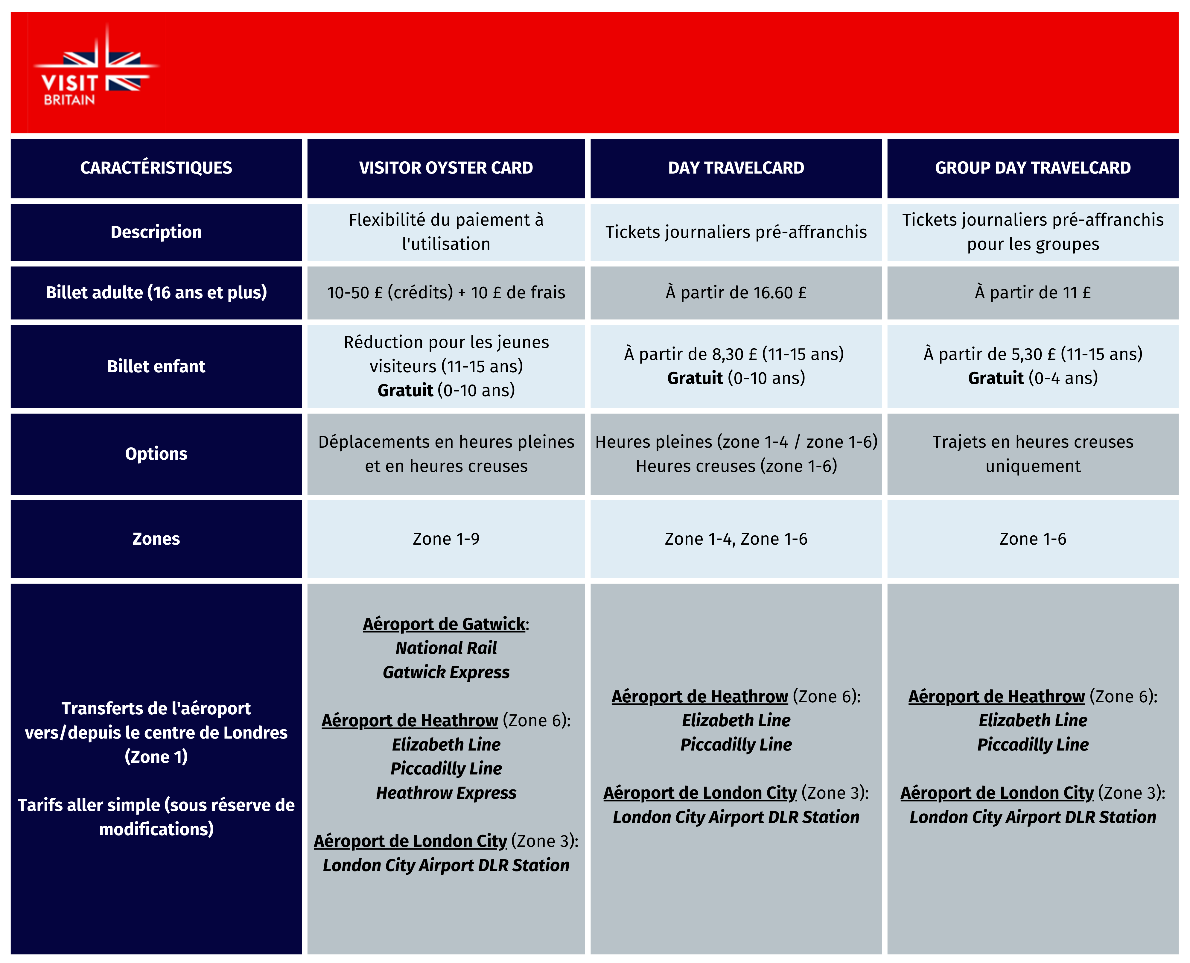 Utilisez notre tableau pratique ci-dessous pour comparer facilement la Visitor Oyster card, la Day Travelcard et la Group Day Travelcard, et découvrir quelle option de voyage à Londres vous convient le mieux.